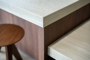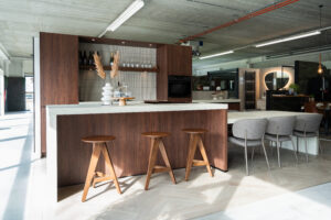De wens voor een nieuwe keuken ontstond toen het bedrijf een gezelligere uitstraling wilde creëren voor bezoekers. “We wilden dat mensen, zodra ze binnenkomen, direct een huiskamergevoel krijgen,” vertelt Kelly. “We voeren hier onze wensgesprekken met klanten, maar houden er ook onze vrijdagmiddagborrel. Daarom wilden we graag een combinatie van een hoog en een laag gedeelte: aan de hoge kant borrelen we, aan de lage kant voeren we gesprekken met klanten.”