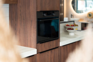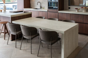 Een opvallend element is het eiland, waarin het keramische blad naadloos overloopt naar beneden. “Dat vind ik het mooiste onderdeel,” zegt Kelly. “Het oogt als één meubelstuk, dat wilden we graag. Het blad is groot en robuust, echt een statement.” Hoewel het blad in de beginfase twee keer gebarsten bleek, werd dat probleem uitstekend opgelost. “De service van Decokeuken was echt top. Dat geeft vertrouwen.”