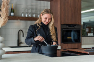 Een belangrijk uitgangspunt was dat de keuken niet alleen mooi moest zijn, maar ook écht gebruikt kon worden. “Het is geen showroomkeuken,” lacht Kelly. “We koken hier regelmatig, ook met klanten. Iedere dag proberen we wel iets te bakken, dat maakt de sfeer gezellig en de winkel ruikt heerlijk.” De oude keuken stond achter in het magazijn en werd nauwelijks gebruikt. “Nu staat de keuken centraal en maken we er elke dag gebruik van. Dat is echt een verschil.”