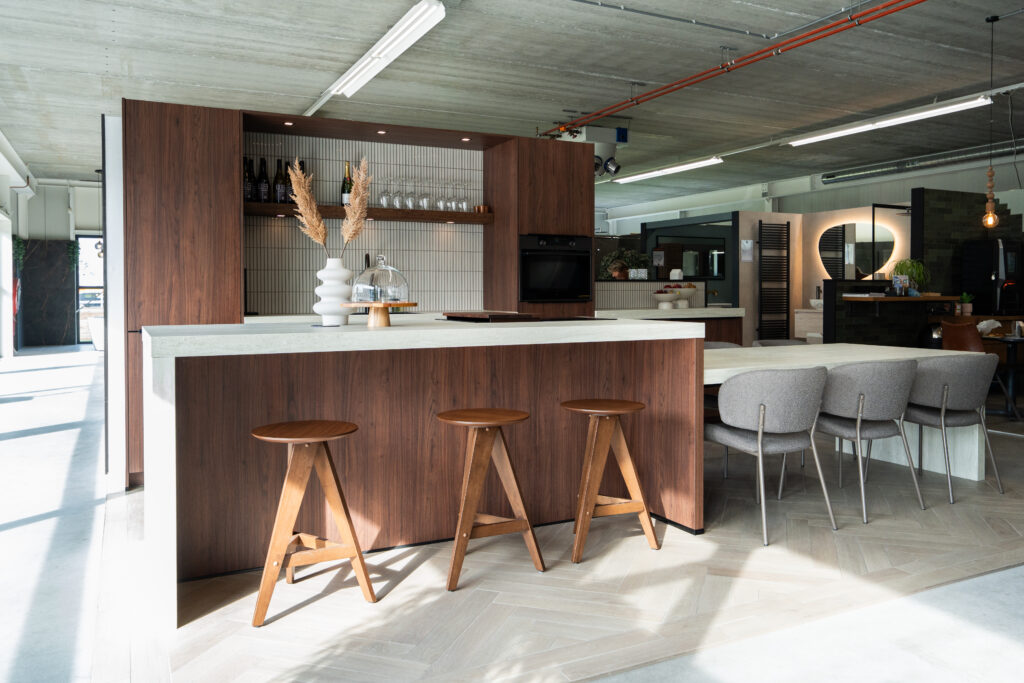 Qua stijl kozen ze bewust voor warme, natuurlijke tinten. “Omdat we natuurlijk in de tegelbranche zitten, wilden we graag dat het travertin goed uit zou komen. Dat zie je mooi terug in de nis. Donker hout en travertin zijn helemaal van nu, en het past perfect bij de rest van de showroom. Misschien is het over tien jaar niet meer dé trend, maar nu klopt het helemaal.”