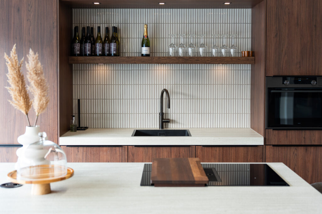 Een opvallend element is het eiland, waarin het keramische blad naadloos overloopt naar beneden. “Dat vind ik het mooiste onderdeel,” zegt Kelly. “Het oogt als één meubelstuk, dat wilden we graag. Het blad is groot en robuust, echt een statement.” Hoewel het blad in de beginfase twee keer gebarsten bleek, werd dat probleem uitstekend opgelost. “De service van Decokeuken was echt top. Dat geeft vertrouwen.”